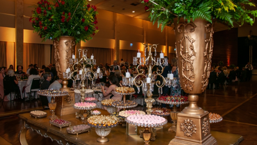 O jantar, ponto alto da noite, foi uma experiência gastronômica refinada. O cardápio, composto por um prato de entrada de salmão acompanhado por saladas frescas, seguido de filé com legumes refogados e encerrando com uma irresistível sobremesa gelada, recebeu elogios pela sofisticação e sabor. As delícias da noite não pararam por aí. Logo na entrada do salão, uma mesa com diversos docinhos coloridos e deliciosos divertiram os paladares dos convidados.