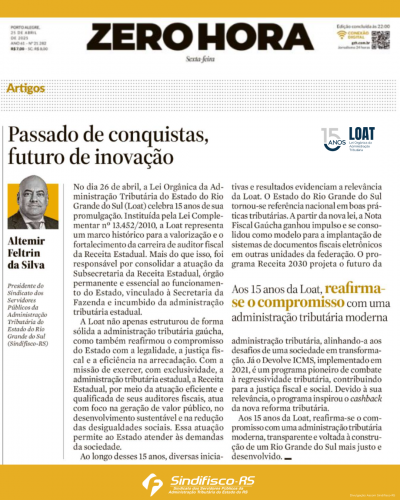 Artigo publicado originalmente no jornal Zero Hora no dia 25 de abril de 2025.No dia 26 de abril, a Lei Orgânica da Administração Tributária do Estado do Rio Grande do Sul (Loat) celebra 15 anos de sua promulgação. Instituída pela Lei Complementar nº 13.452/2010, a Loat representa um marco histórico para a valorização e o fortalecimento da carreira de Auditor-Fiscal da Receita Estadual. Mais do que isso, foi responsável por consolidar a atuação da Subsecretaria da Receita Estadual, órgão permanente e essencial ao funcionamento do Estado, vinculado à Secretaria da Fazenda e incumbido da administração tributária estadual.